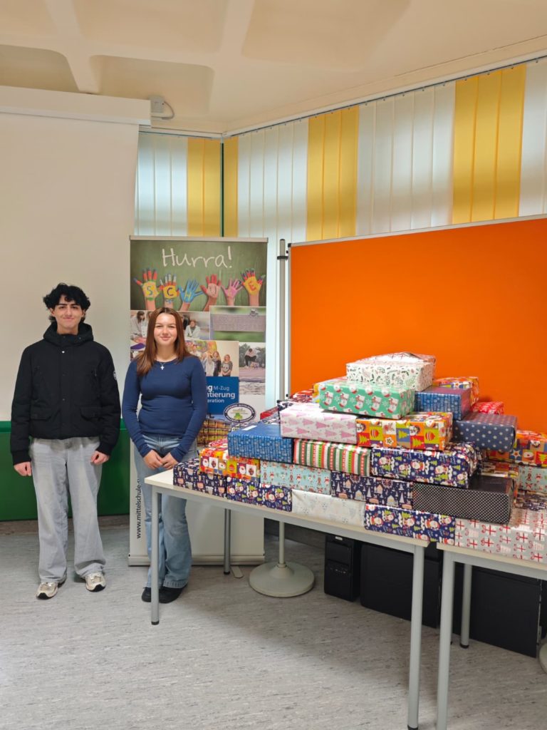 Schülersprecherin Helene Wolf und Schülersprecher Noor Aldeen Maatouk übergaben stolz die Päckchen der Schüler.